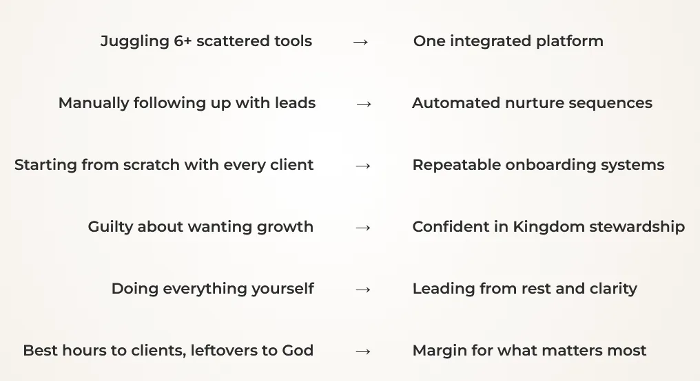 What if you could have both? Integrated systems that scale AND a Kingdom framework that honors God. That's exactly what we do. Most business consultants give you one or the other. You get the tech guy who knows platforms but doesn't understand your faith. Or you get the Christian business coach who loves Jesus but can't help you fix your scattered systems. You need both. And that's what makes this different.
